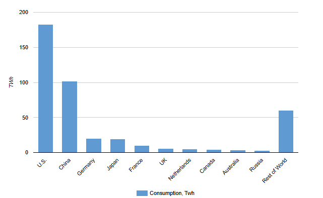 Figure 1 shows power consumption by data centers in 2024. Key observations: In 2024, power demand for data centers worldwide was 415 TWh, about 1.4% of the total estimated global power consumption 29,000–31,000 TWh. Two countries accounted for roughly 69% of global data center power consumption: