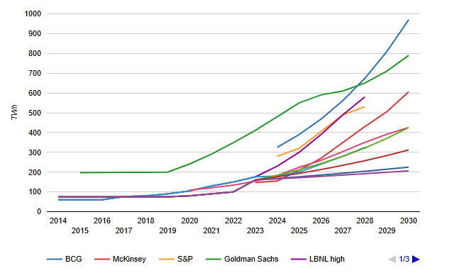 Figure 1 shows various forecasts from multiple sources for power consumption by data centers through 2030, revealing a wide range of outcomes and highlighting several ongoing uncertainties: