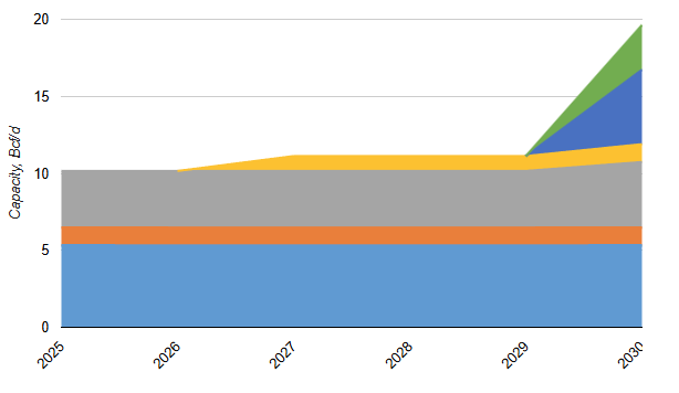 China’s pipeline imports arrive via several operational routes as shown in Figure 1, with additional capacity expected later in the decade. The Central Asia–China pipelines (Lines A, B, C), supplied by Turkmenistan, Uzbekistan, and Kazakhstan, have been operational since 2009 and deliver 5.3 Bcf/d, remaining steady through 2030.