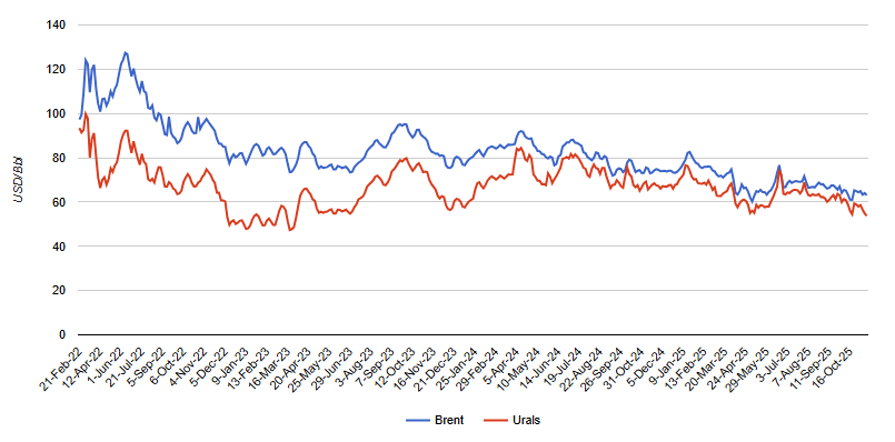 The weekly Brent oil price and Russia’s Urals oil price (USD/Bbl), from February 2022 through November 2025, illustrates the price differential between these two prices.