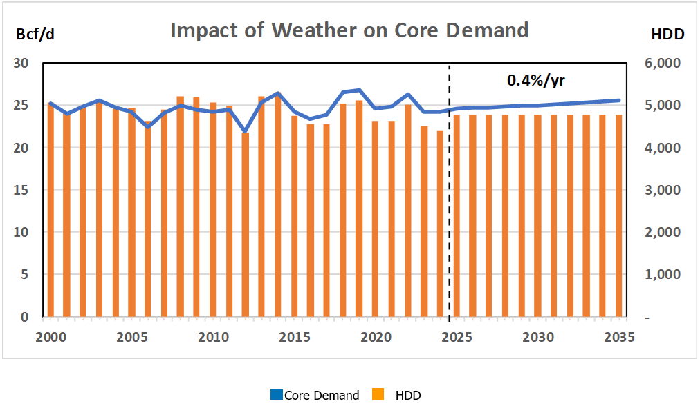 Core Demand (residential and commercial sectors) mainly uses natural gas for winter heating loads. As illustrated in the chart, core demand correlates well to Heating Degree Days (HDD) with yearly swings resulting from warmer or cooler temperatures. Customer counts drive underlying Core demand growth of 0.4%/year. Efficiency factors on a normalized basis (Mcf/Customer/HDD) have steadied over the last decade, however, Incorrys is forecasting continued efficiencies of 0.1%/year. Efficiency factors include new building standards, opportunities to use modified technology applications such as adjustable smart digital thermostats, and conservation measures in existing housing stock (insulation, new windows).