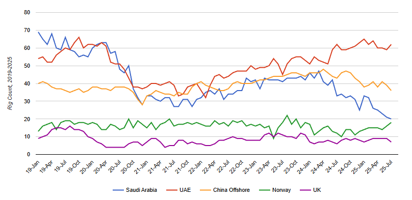 International oil rig counts (2019-2025) by main producing regions of Saudi Arabia, UAE, China offshore, Norway, and the UK. Additional chart showing the oil rig counts for the US and Canada. The rig count usually acts as a leading indicator of expected oil production. Rig counts have remained flat in most large oil regions reporting rig count data.