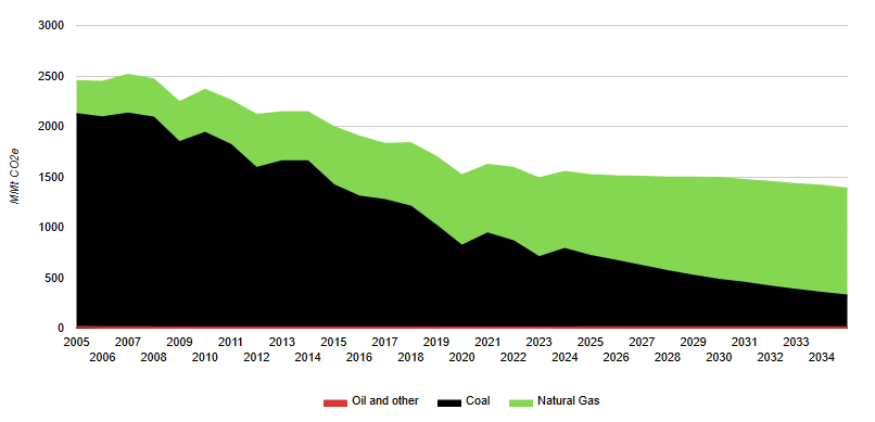 North American power generator emissions to 2035 by fossil fuel (coal, natural gas, oil/other). By 2035, power carbon emissions will be reduced from 2005 levels in both the US (44% lower) and Canada (36% lower) – both countries benchmark year for Paris Commitments.