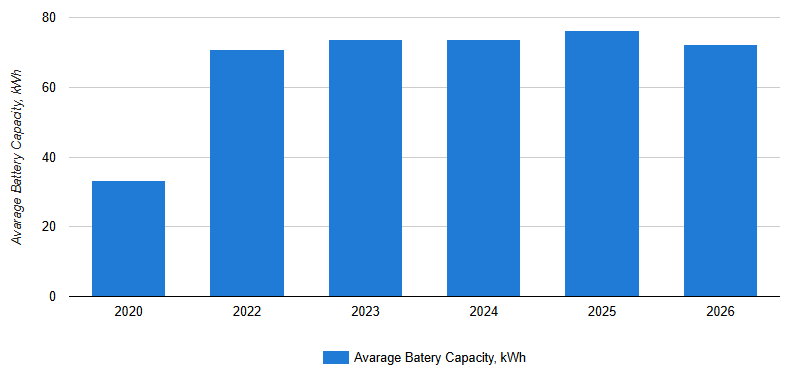 Average BEV battery capacity increased rapidly in the early 2020s, more than doubling from about 33 kWh in 2020 to over 70 kWh by 2022. Growth has since stabilized as more mid-range electric vehicles enter the market. While premium models offer very large batteries, the broader mix of vehicles has kept overall average capacity relatively flat.