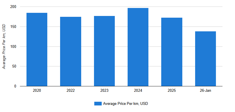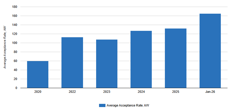 EV charging performance has improved significantly, with average charge acceptance rates rising from 60 kW in 2020 to around 165 kW by 2026. These gains reflect advances in battery technology, thermal management, and fast-charging infrastructure. Faster charging times are reducing usability barriers, making electric vehicles more practical for long-distance travel and supporting broader mass-market adoption.