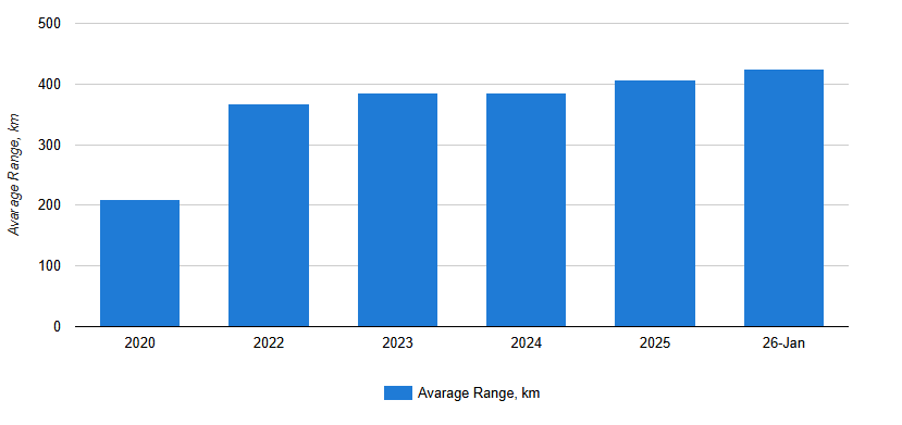 Average BEV driving range has increased steadily, rising from about 200 km in 2020 to over 400 km by 2023–2024. Early gains were driven by rapid improvements in battery capacity and efficiency, while growth has since moderated. Overall, increasing range is reducing range anxiety and supporting broader adoption of electric vehicles across global markets.