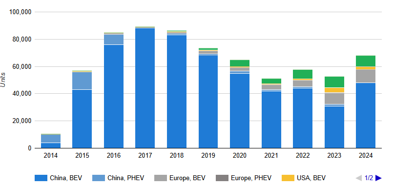 Global electric bus adoption is overwhelmingly driven by China, which dominates sales and favors BEVs over PHEVs. While Europe and other regions are expanding steadily, their volumes remain much smaller. The United States remains a niche market. Overall, electrification in public transport is led by BEVs, with PHEVs playing only a limited transitional role worldwide.