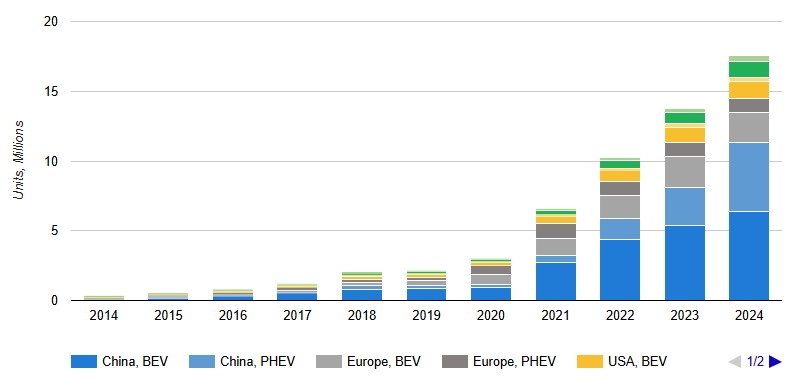 Global electric passenger car sales surged from 0.33 million in 2014 to 17.5 million in 2024, driven by policy support, falling battery costs, and stricter emissions rules. China leads with a dominant market share, followed by Europe and the United States. Growth accelerated through 2020–2023 but began to slow after 2023, with BEVs remaining the majority technology.