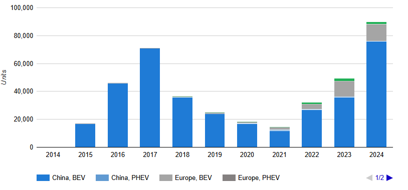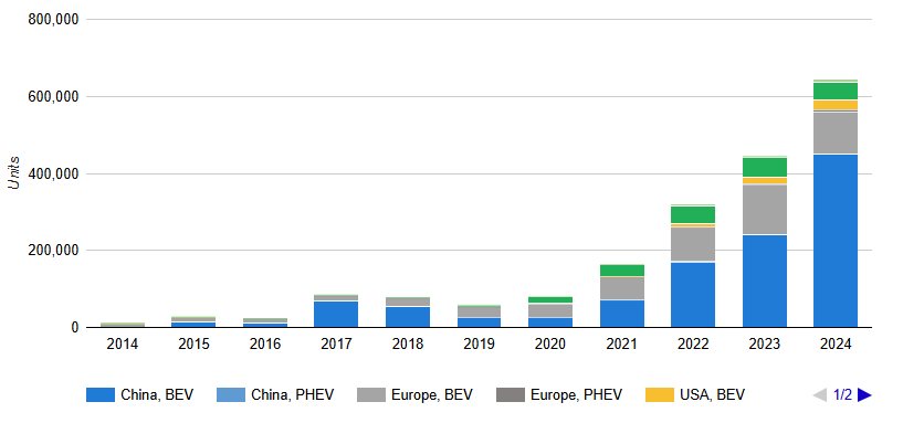 Global electric truck sales are accelerating from a low base, led by China’s early dominance and Europe’s rapid recent growth. BEV trucks account for the vast majority of adoption, while PHEVs remain marginal across all regions. China drives volumes through policy cycles, while Europe scales quickly after 2021. Other regions are still in early pilot stages of electrification.