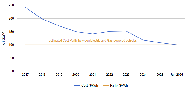 Lithium-ion battery costs continue to decline, reaching around $108/kWh in 2025, driven by scale, technology improvements, and strong cost advantages in China. While prices remain higher in North America and Europe, the gap is narrowing. Falling battery costs are improving EV affordability, with continued progress toward the key $100/kWh threshold and broader market competitiveness.