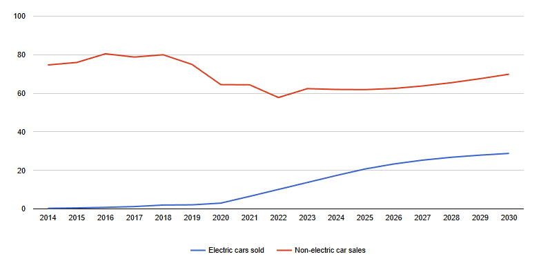 Global electric car sales have grown rapidly, increasing from 0.3 million in 2014 to 17.3 million in 2024, driven by lower battery costs and stricter regulations. Meanwhile, non-electric car sales have declined and remain below pre-2020 levels. As a result, EV market share has risen to 28% and is projected to reach around 41% by 2030.