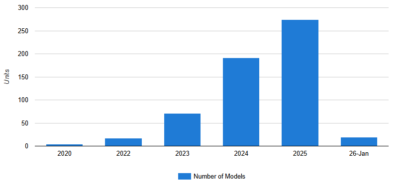 The number of BEV models continues to grow rapidly, reaching around 275 in 2025 as automakers expand their electric portfolios across multiple vehicle segments. At the same time, many earlier models are being discontinued due to fast-changing market conditions. This trend highlights a transition from early EV adoption to large-scale competition and portfolio optimization by global manufacturers.