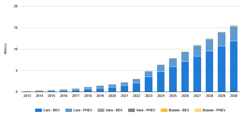 By 2030, Incorrys expects the total number of registered electric vehicles in the United States to reach around 16.1 million units. Battery electric vehicles (BEVs), including cars, vans, and buses, are projected to dominate the EV fleet, accounting for roughly 75% of total registered electric vehicles. Plug-in hybrid electric vehicles (PHEVs) are expected to represent about 25% of the total EV stock in 2030.