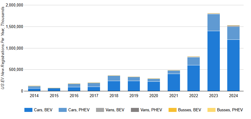 U.S. electric vehicle registrations grew rapidly after 2021, reaching about 1.53 million units in 2024. Passenger cars dominate the market, accounting for roughly 98% of new EV additions, with BEVs leading growth. After peaking in 2023, total registrations slightly declined in 2024, indicating a moderation in growth following a period of strong expansion.